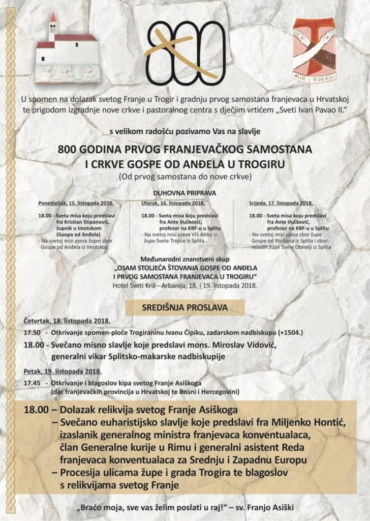 Poziv na proslavu 800. obljetnice osnivanja prvog franjevačkog samostana Gospe od Anđela u Trogiru Posted on 10/10/2018 by admin
