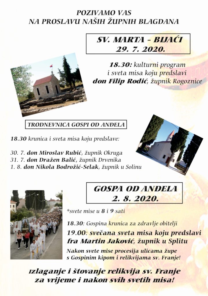 Proslava župnih blagdana 2020. Posted on 27/07/2020 by admin Pozivamo Vas na proslavu naših župnih zaštitnica – svete Marte i Gospe od Anđela!